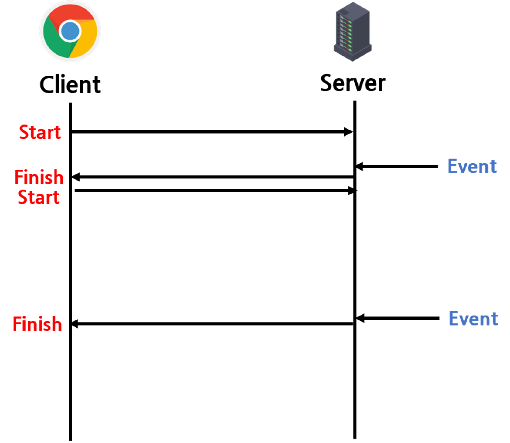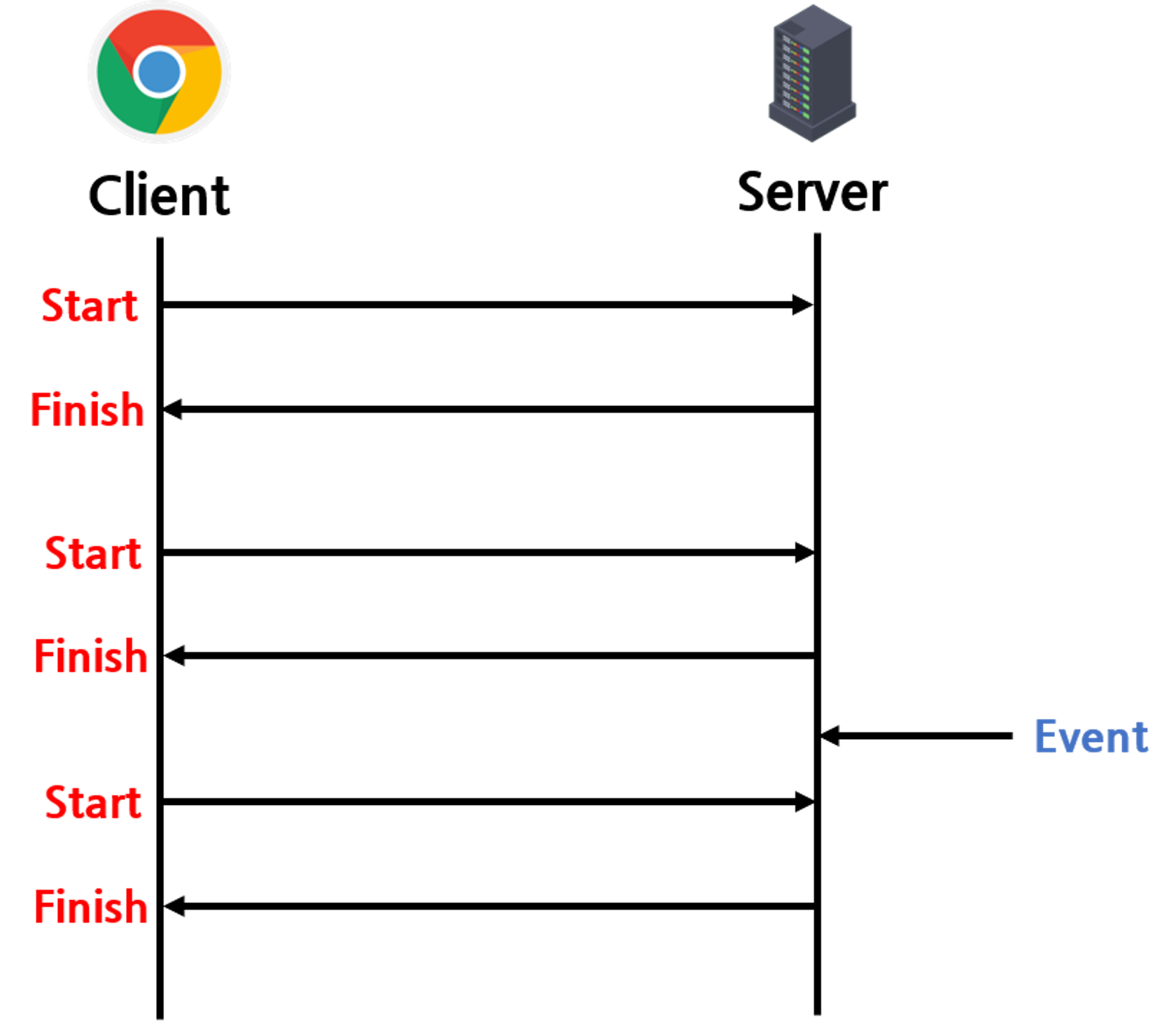긴 Connection을 갖도록 Request를 보내고, 이 지속 시간 동안 이벤트가 발생하면 그 이벤트에 대한 값을 유지되고 있는 Connection을 통해서 보내면 된다.